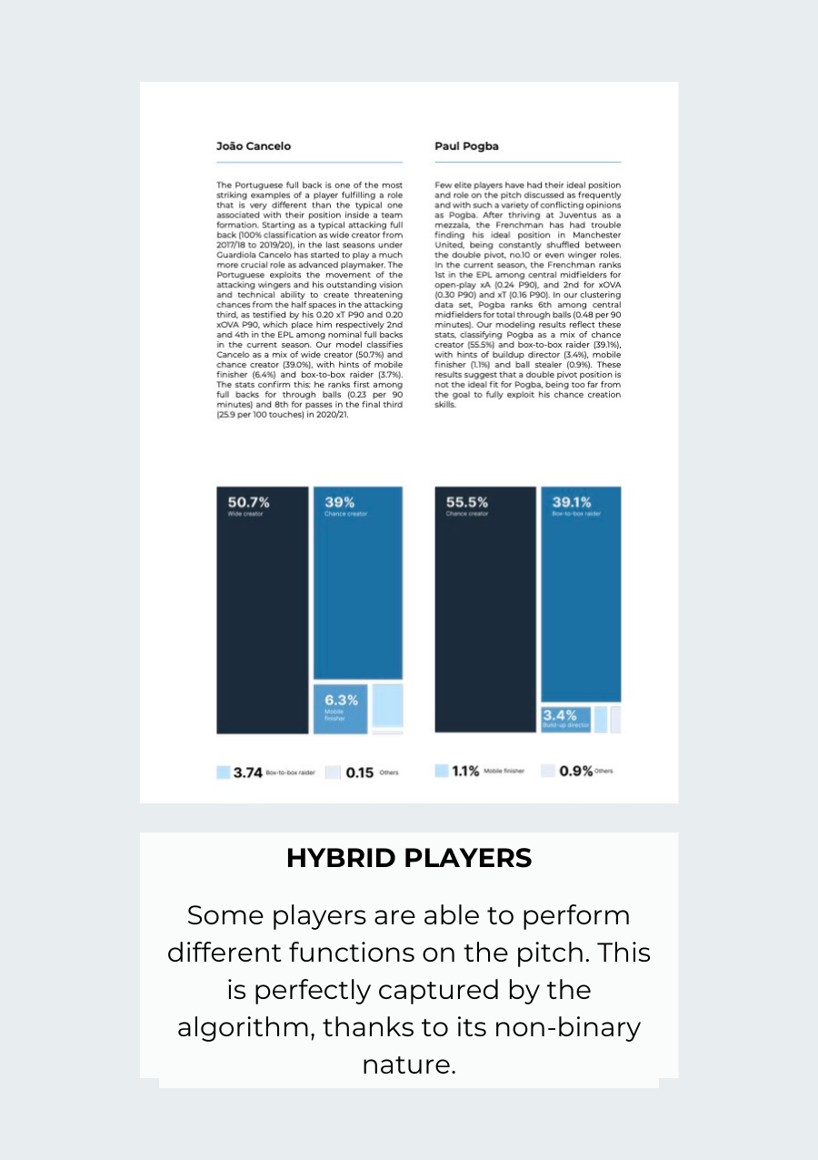 Using detailed stats from season 2017/18 to 2020/21, we applied a clustering analysis to categorise players into thirteen groups, based on their function on the pitch. We structured our analysis to reconstruct not only a class label for each player, but a full hybridation profile, with the classification probability for all thirteen clusters, allowing us to recover a more unique (albeit not conclusive) characterisation.